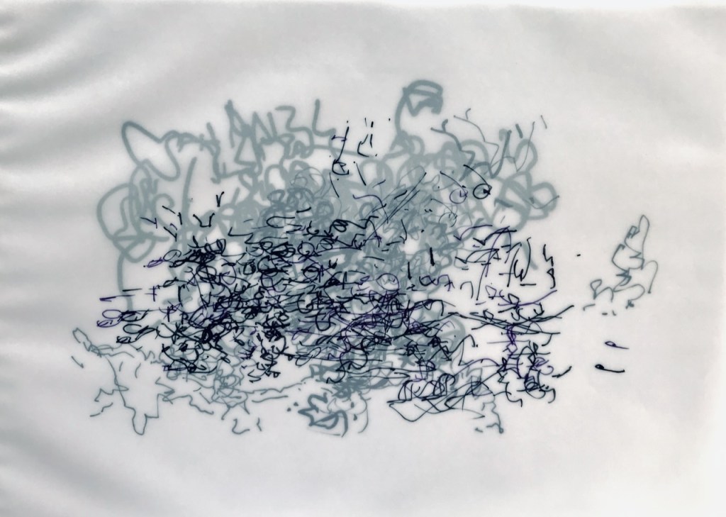 Start by trying to tune in to a single sound. Don’t try to think too much about the source of the sound; just explore how it feels to hear it. Is it rough? Is it loud? Is it delicate? Does it swirl? Does it judder? Is it flat? Try to make your marks reference those qualities and play with your drawing tool gesturally to represent how those sounds feel.