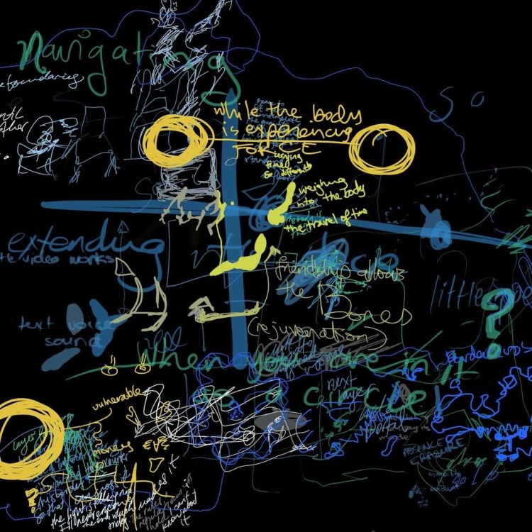 Make a drawing of how it feels to be a body in a space. Choose somewhere you can sit comfortably with a sketchbook or some paper and something to draw with. Close your eyes and tune in to the space around you. Listen to the sounds you hear, notice how it feels to be in that space at that moment and try to capture your experiences through the marks you make on paper. Imagine your marks as an interpretation of the qualities of what you feel.