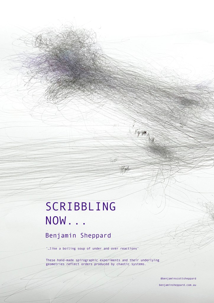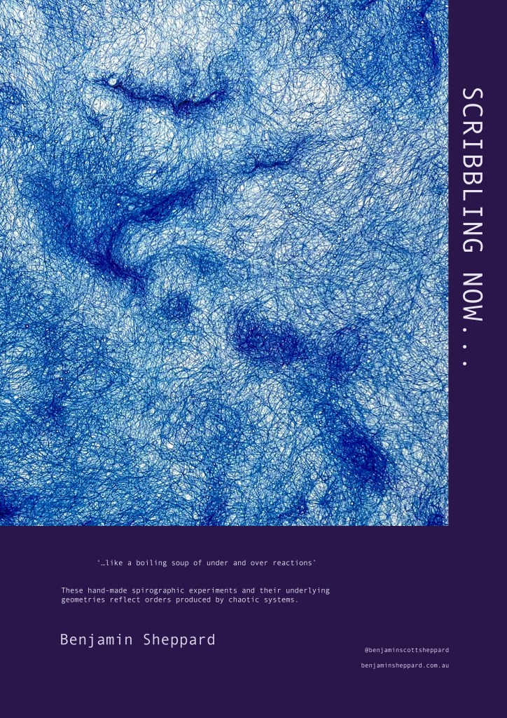 These hand-made spirographic experiments and their underlying geometries explore and reflect on the order produced by chaotic systems. Born from the four-part rotary pivots of shoulder, elbow, wrist, with the ultimate release from the finger-thumb pince, these seemingly chaotic scribbles often coalesce to reveal tiny circular absences amongst curious accumulations of line.