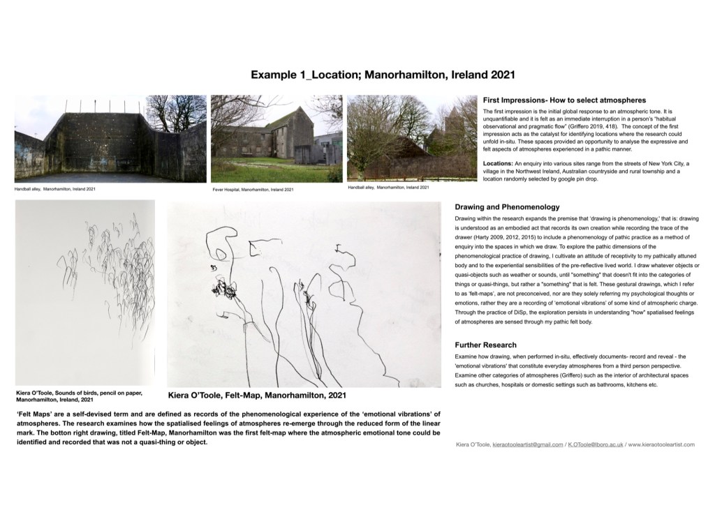 Drawing within the research expands the premise that ‘drawing is phenomenology,’ that is: drawing is understood as an embodied act that records its own creation while recording the trace of the drawer (Harty 2009, 2012, 2015) to include a phenomenology of pathic practice as a method of enquiry into the spaces in which we draw. The drawings are referred to as ‘Felt Maps’ which is a self-devised term and are defined as records of the phenomenological experience of the ‘emotional vibrations’ of atmospheres. This research contributes and expands upon the knowledge and practice of drawing as a phenomenological act to offer a more meaningful account of what is usually referred as ‘’in-situ’, background’, ‘surroundings’ or ‘environment’ within the process of drawing in-situ process.