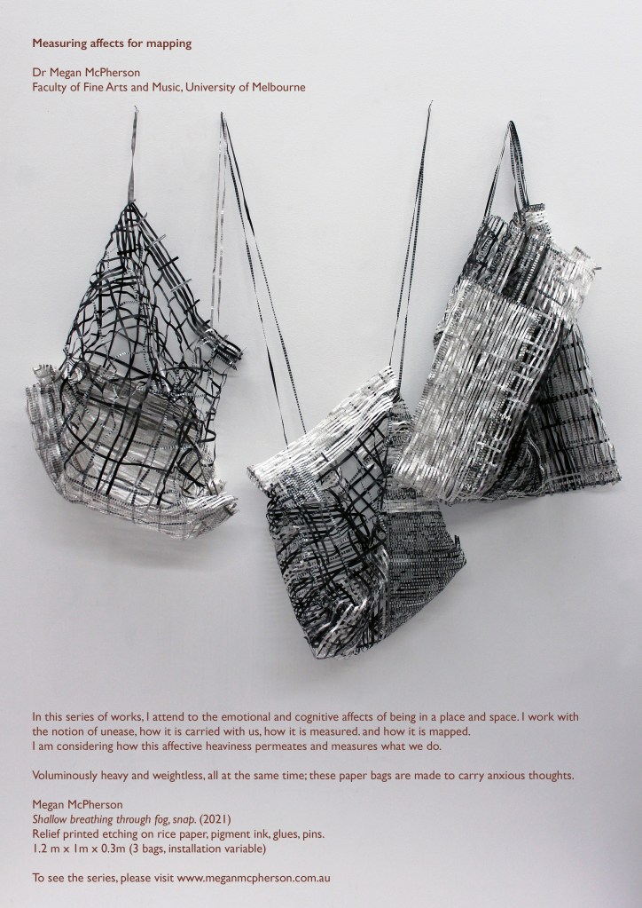 By mapping through making, I am considering how this affective heaviness permeates and measures what we do. I attend to the contextualising work that mapping does, giving points of reference, and overlaying knowledge of what has gone before the creation of the map. Voluminously heavy and weightless, all at the same time; these paper bags are made to carry anxious thoughts.