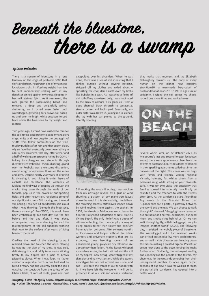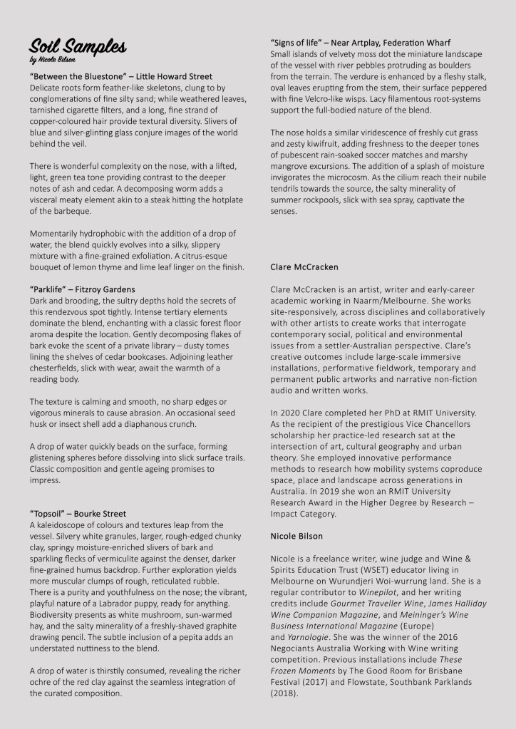 Almost all terrestrial life on Earth depends on soil – from microorganism through to plants and animals – yet, as Tim Ingold has noted, modern cities insulate us from sensing soil (2004). This project used creative practice to render soil’s aliveness tangible: to ask how can creative practitioners render urban soil visible? Creative writing and the highly trained olfactory of a sommelier collaborated to demonstrate how soil can be smelt, felt, and seen.