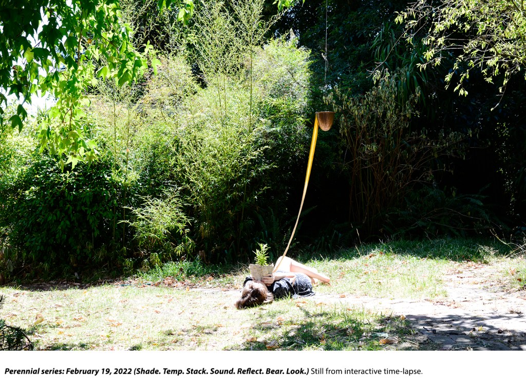 Perennial series involves an ongoing, garden-based nourishment ritual. Time-lapse photography records the artist and a Tagetes lucida plant facing the sun, tethered together by a silk wick drawing water from a copper vessel overhead. A temporal disconnection from digital communications is enabled through the plant’s requisition of the artist’s focus and movements.