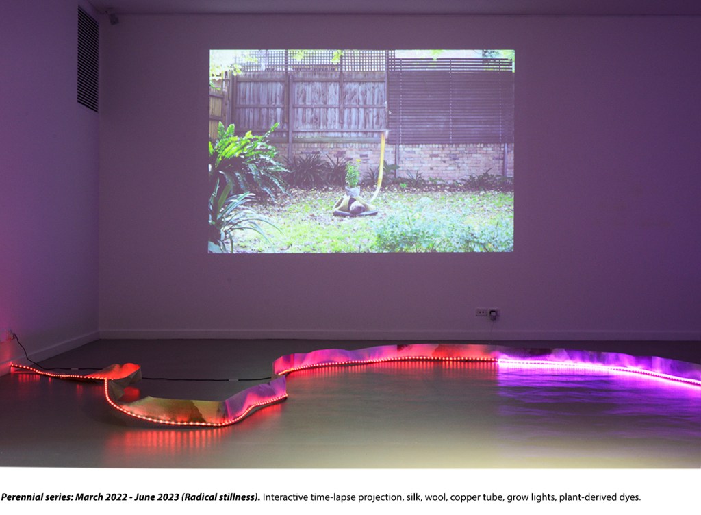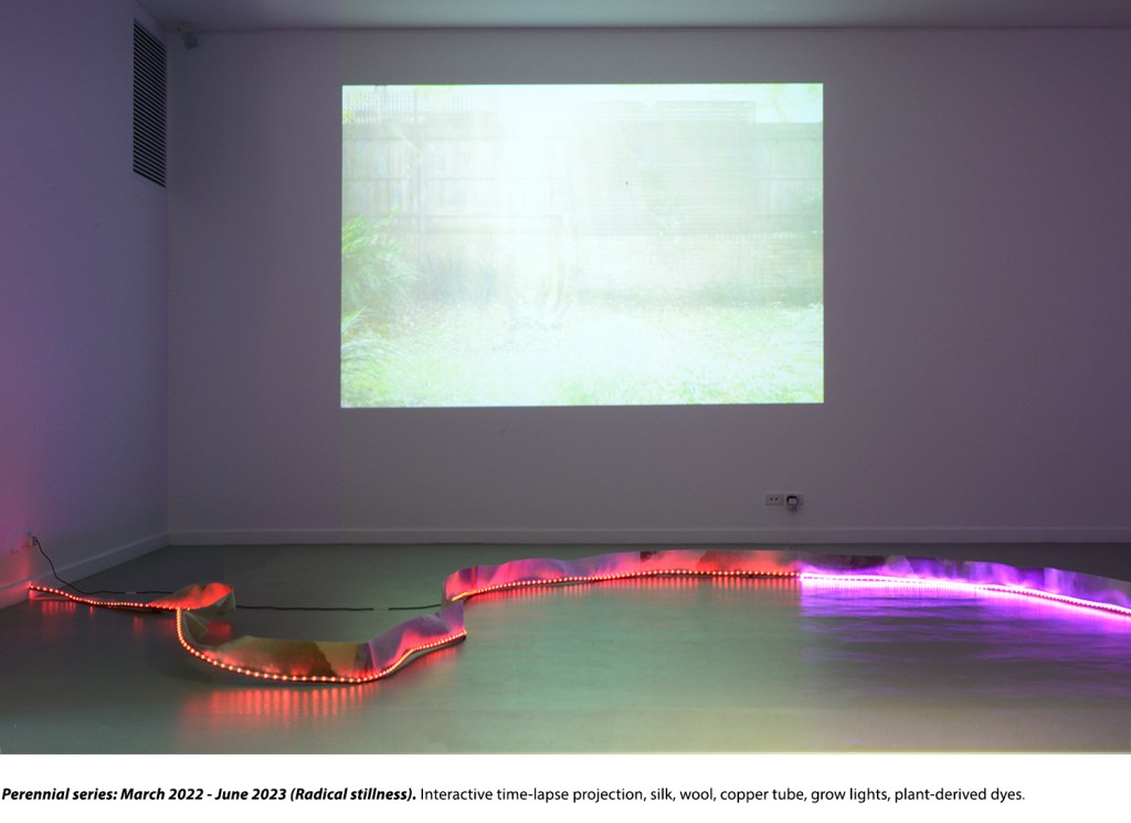 Attempts at plant-human durational convergence in Perennial series produce a type of vegetal training of human movement. The inverting of plant-human instrumental relations implicit in this aims to hold the artist and viewer in a state of stillness, where meditative-contemplative thinking is allowed to flourish.